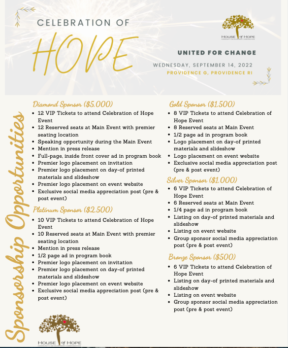 The Celebration of Hope will help raise necessary funds as House of Hope CDC brings its effective, life changing programs to those experiencing homelessness in Rhode Island.